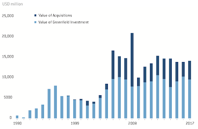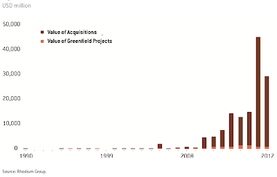 By the end of 2017, the total cumulative value of Chinese foreign direct investments in China reached $140 billion, well below the $256 billion that the U.S. has invested in China. One issue that is slowing Chinese investments in the U.S. is increased investment screenings by the Committee on Foreign Investment in the United States, largely as a retails of changing threat assessments. As well, in contrast to American firms which prefer to invest in greenfield projects, Chinese firms prefer to invest in existing companies through acquisitions.