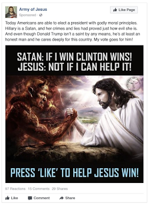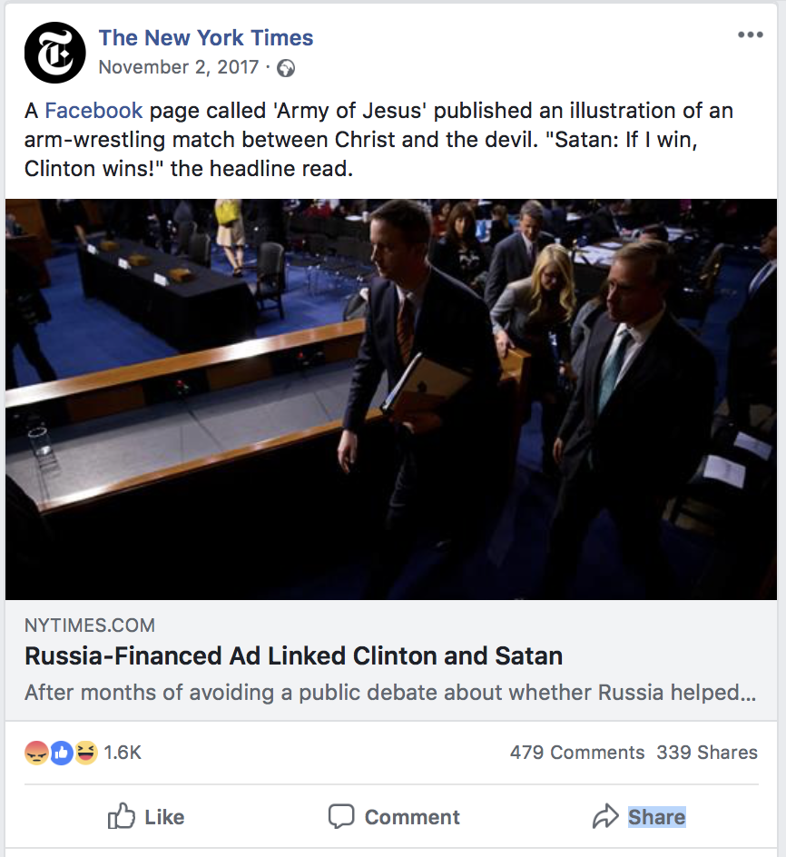 According to the New York Times, the bastion of media truthiness, during the 2016 election, Russians turned most often to Facebook to stir up discontent among American voters. Here is a posting from the New York Times Facebook page regarding Russian financing of an ad linking Hillary Clinton to Satan: