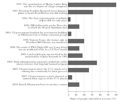 To put fake news into perspective, here is a graphic showing the percentage of Americans that believe a selection of historical partisan conspiracy theories: