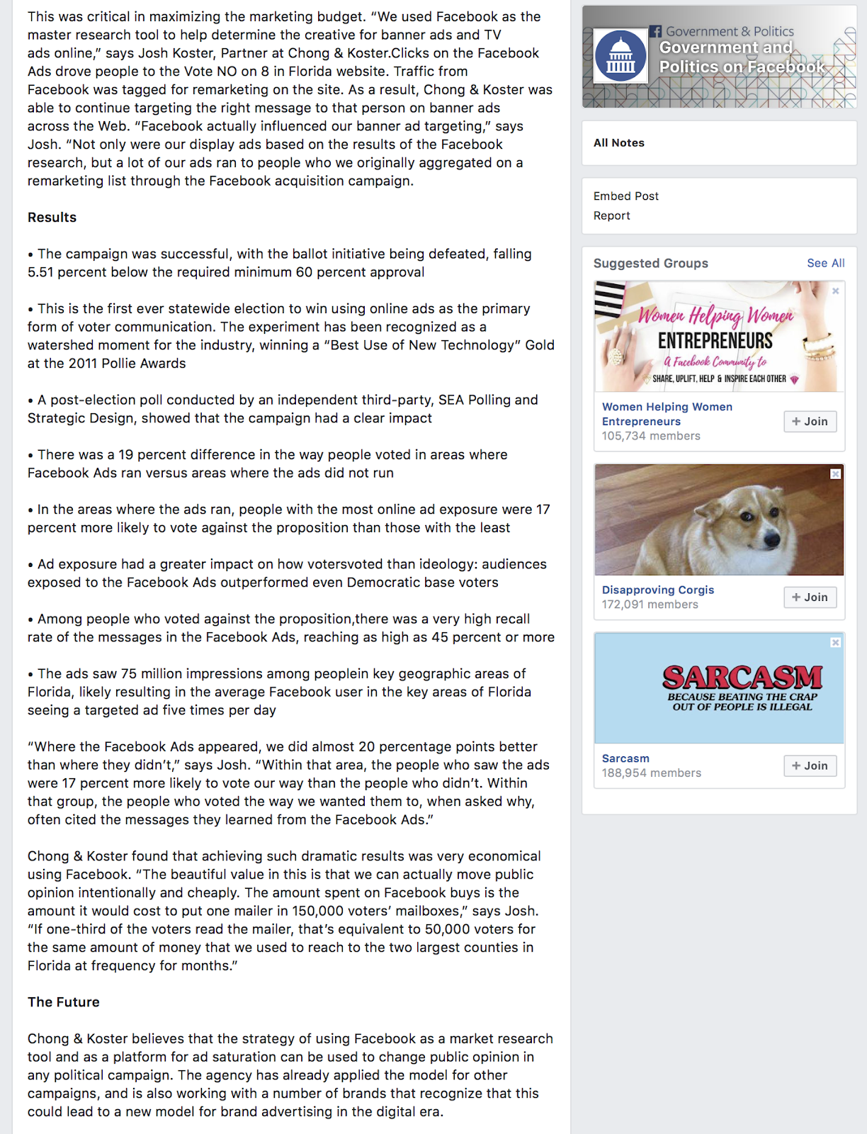 "Chong & Koster found that achieving such dramatic results was very economical using Facebook. “The beautiful value in this is that we can actually move public opinion intentionally and cheaply. The amount spent on Facebook buys is the amount it would cost to put one mailer in 150,000 voters’ mailboxes,” says Josh Koster, partner at Chong and Koster. “If one-third of the voters read the mailer, that’s equivalent to 50,000 voters for the same amount of money that we used to reach to the two largest counties in Florida at frequency for months.” (my bold)