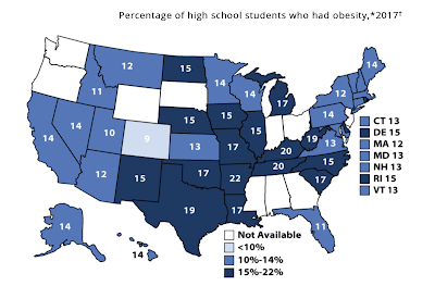 Once a child or younger adult is significantly overweight, it is extremely difficult to reverse the trend. According to the CDC, data from 2015 to 2016 shows that nearly one in five school age children are obese. Here is a map showing the state-by-state statistics for the percentage of high school students that were obese in 2017: